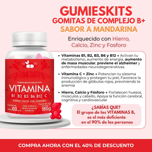 GUMIESKITS: GOMITAS DE COMPLEJO B, VITAMINA B + enrriquecidas con hierro, calcio, zinc y fosforo.